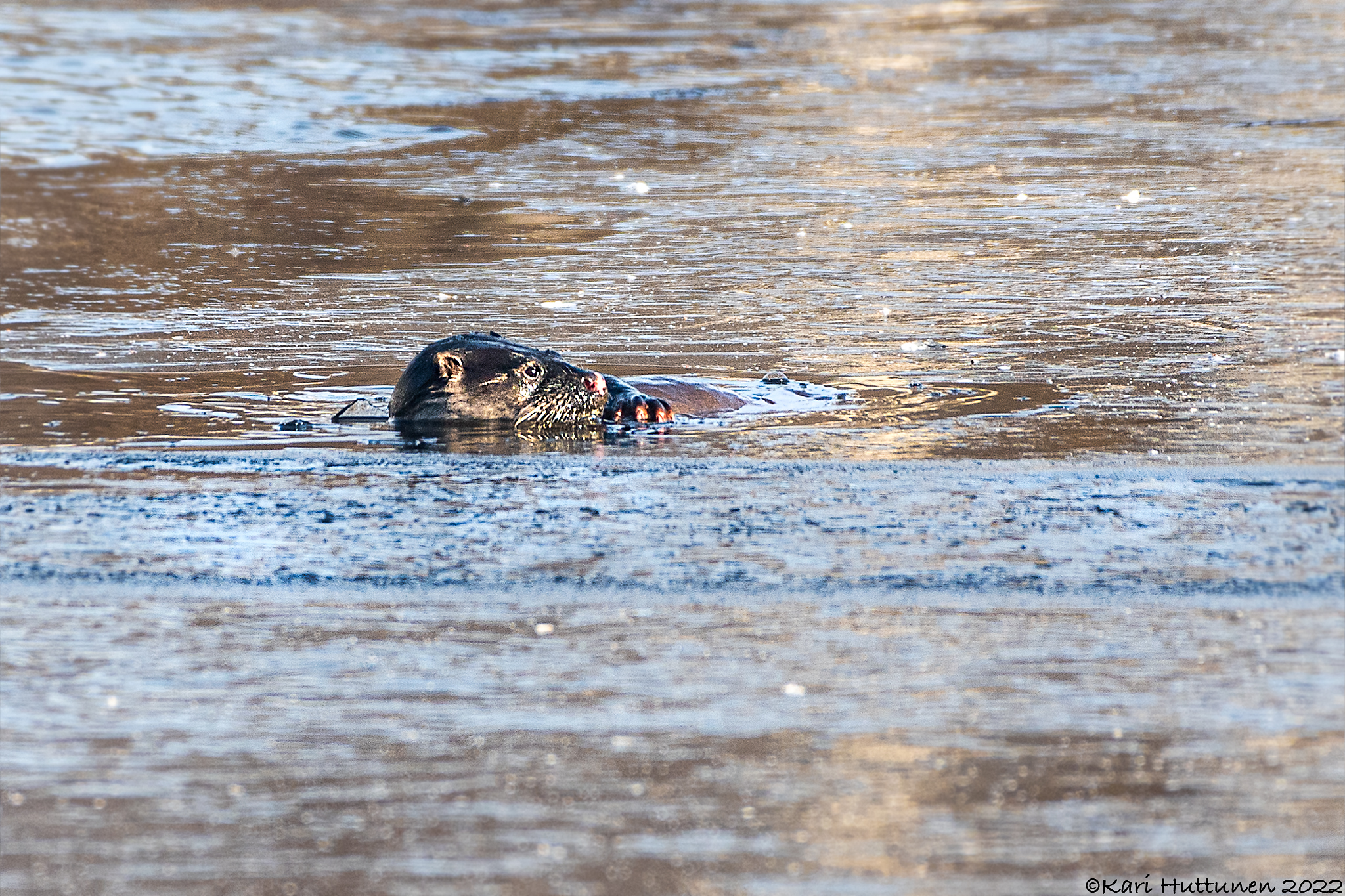 Tuttujen kuvaajien seurassa vierähti toinenkin tunti nopeasti, mutta saukkoa emme nähneet. Huikea aurinkoinen aamupäivä ehti jo kääntyä iltapäivän puolelle, ennen kuin alkoi tapahtua. Joenrannassa kulkevalla luontopolulla vastaani tuli kiikarit kaulassa vanhempi rouvashenkilö, joka kertoi nähneensä juuri hetki sitten saukon uimassa aivan lähistöllä. Tämähän oli loistava uutinen – kamera nopeasti olalta ja muutama askel polulta joenrantaan odottamaan. Ja toden totta, kaivattu saukko ilmaantui sulan ja jään reunaan hetkeksi jotain tutkailemaan, mutta sukelsi sitten pois. Sitkeästä puolen tunnin odottelustani huolimatta, kaveria ei enää näkynyt.