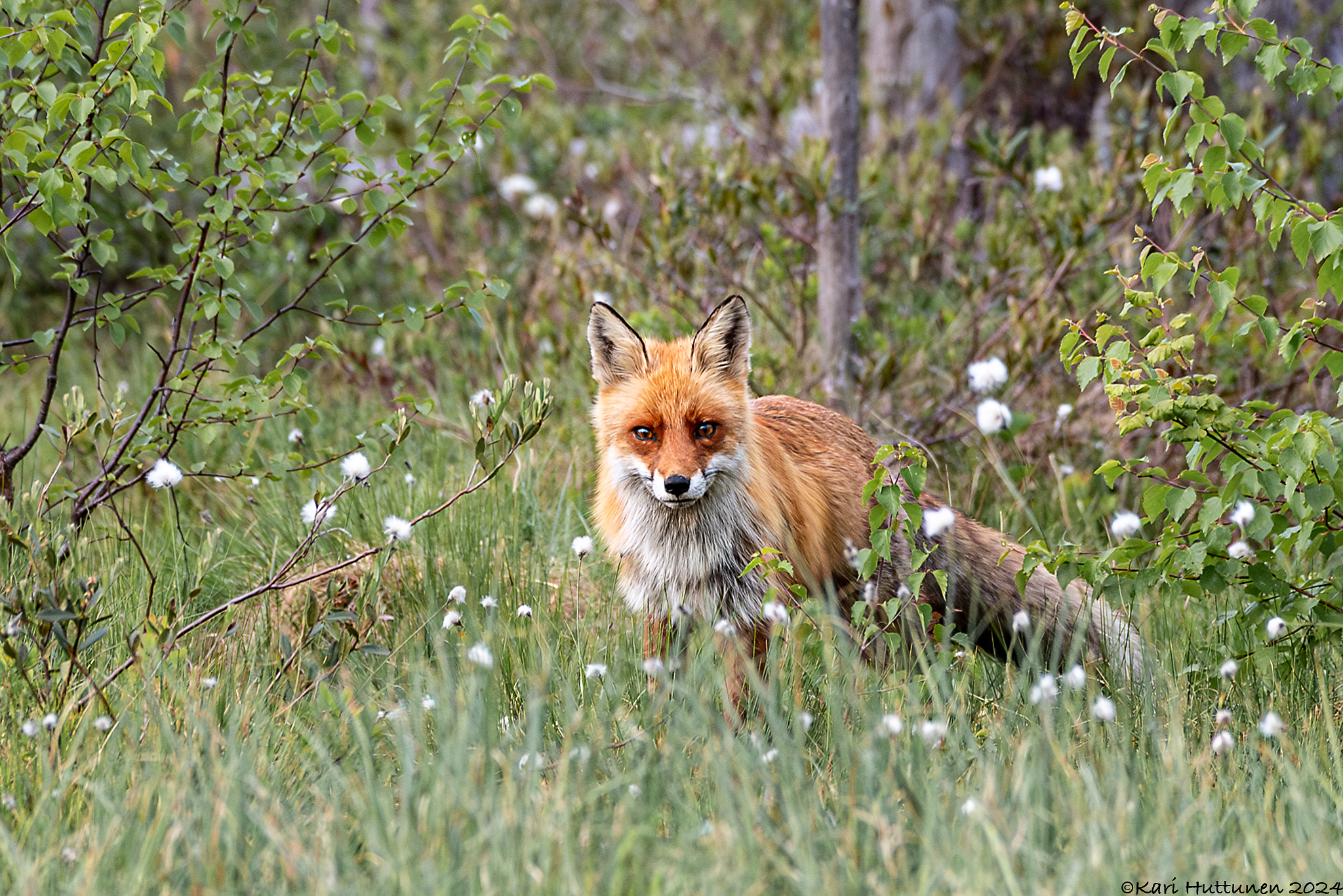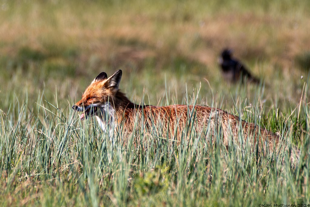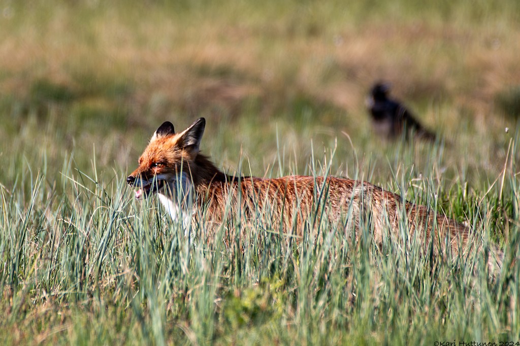 Kello kahdeksan jälkeen huomasin ketun hiipivän kuvauskojuni edessä olevan lammen rantaan – kylläpä hän olikin komean näköinen otus. Vaikka ei kettu kauan malttanut kuvattavana viihtyä, sain napattua siitä muutaman kelpo ruudun. Repolaisen poistuttua takaisin metsän suojaan, ”jouduin” palaamaan kahvittelun pariin ja lähistöllä pyörivän telkkäpariskunnan ja käpytikkojen kuvailuun.