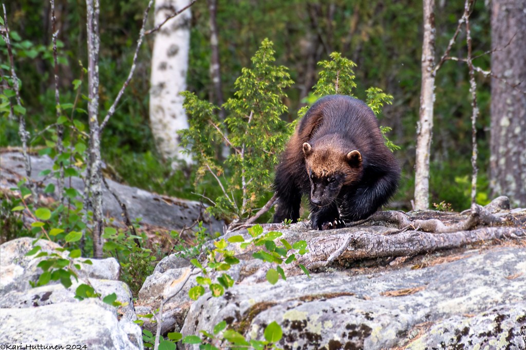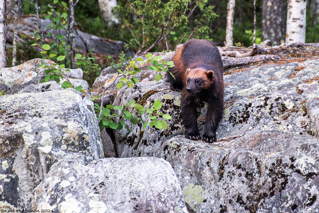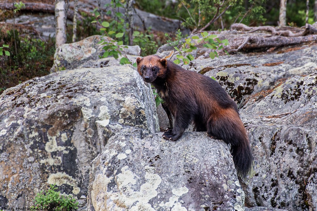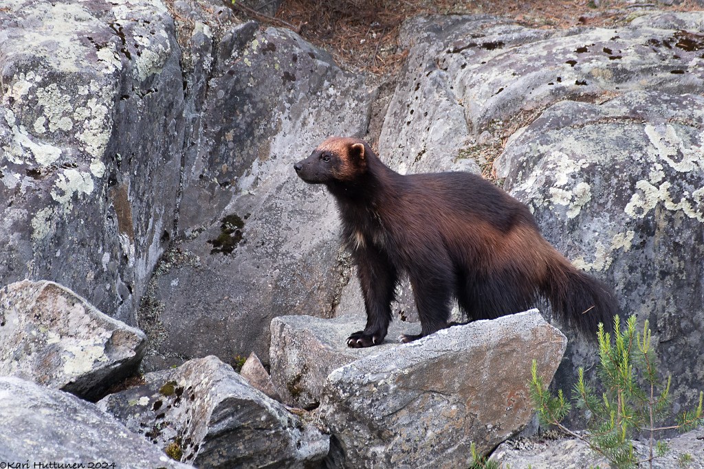 Toinen yö oli aika lailla ensimmäisen toisinto. Kettu kulki ohitseni lammen rantaa, mutta tällä kertaa ahma (eri yksilö) uskaltautui kalliolta alan ja suostui aika mukavasti kuvattavaksi. Oli kyllä upeaa.